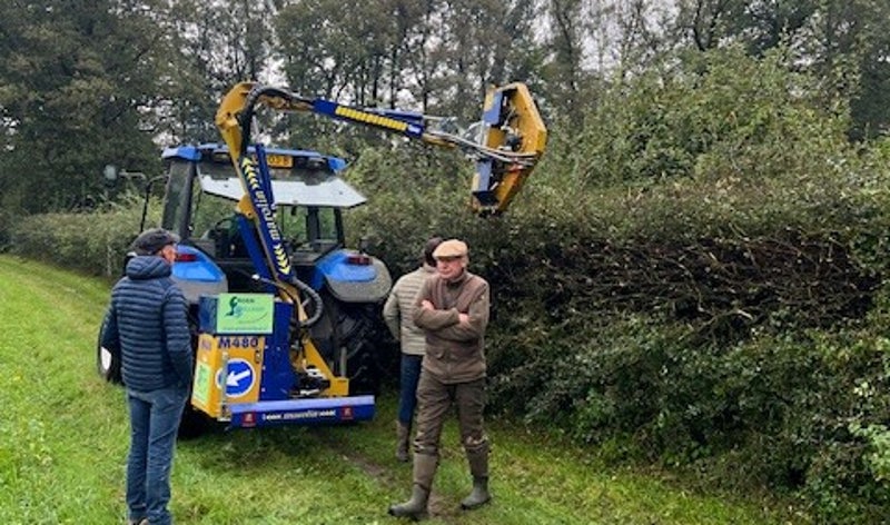 Afgelopen jaren hebben we zoveel heggen geplant, dat we ook willen voorzien in goed en betaalbaar onderhoud. Dit betekent dat we hebben gekozen voor een heggenknipper die handzaam is, want hij kan achter onze meest compacte trekker. Waardoor hij nauwelijks of niet sporen rijdt en scherp draait in kleine ruimtes. Het grootste voordeel voor een groen Salland is, dat hij door de cirkelzagen, een strakke, schone snoeiwond achterlaat, de insectenrijkdom in de heg in leven laat, maar het maaisel wel direct verpulvert. Hierdoor is er weinig snoeiafval op te ruimen.